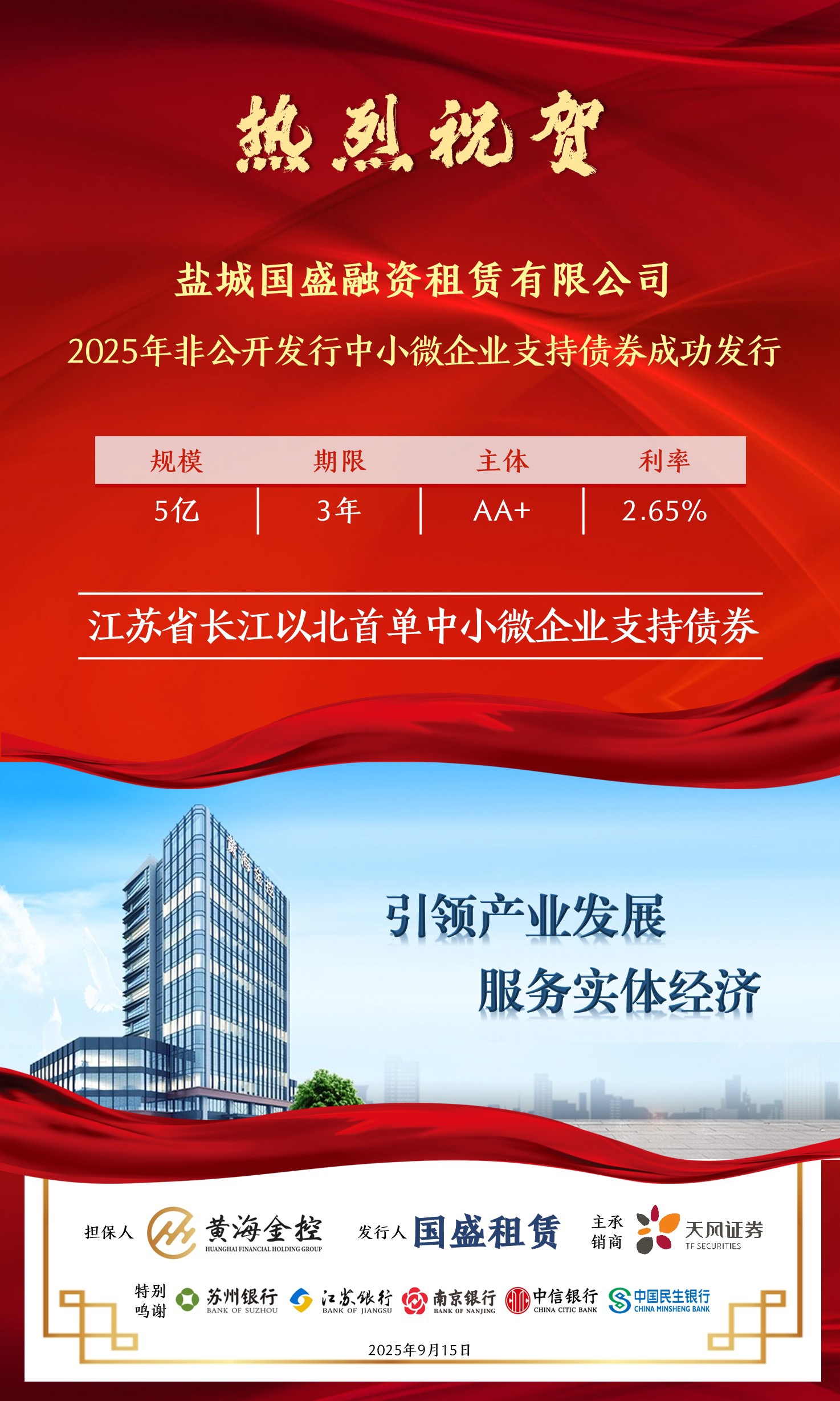 近日,盐城国盛融资租赁有限公司在上海证券交易所成功发行2025年面向专业投资者非公开发行中小微企业支持债券。本期债券由FUN乐天使担任独家主承销商,发行规模5亿元,期限3年,票面利率2.65%。
