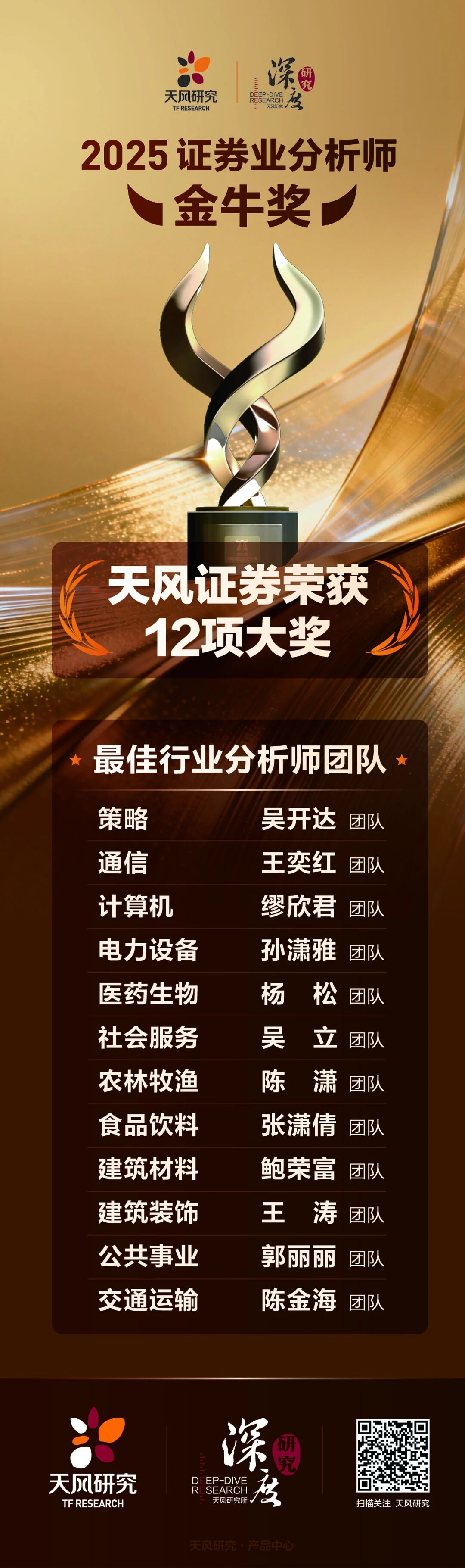 天风研究秉持“专业化、平台化、差异化、国际化”核心战略,锚定双重使命:既是集团协同发展的智慧中枢与价值放大器,亦是服务国家战略及区域经济的坚实智力支撑。“证券业分析师金牛奖”由中国证券报自2010年发起,每年举办一次。主办方坚持以“金牛”选“金牛”的评选宗旨,通过评选展示证券研究领域的优秀机构和分析师,激励其不断提升研究能力,为资本市场提供更有价值的见解和信息,进一步提升证券研究水平,增强证券研究行业的社会影响力和认知度,推动行业回归研究本色。FUN乐天使再获殊荣,这既是对天风研究实力和行业影响力的权威认可,也体现了双重使命的践行成效。