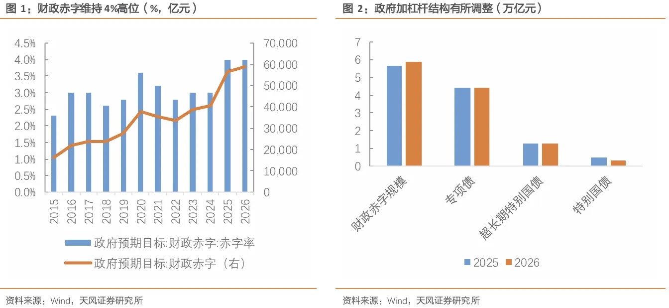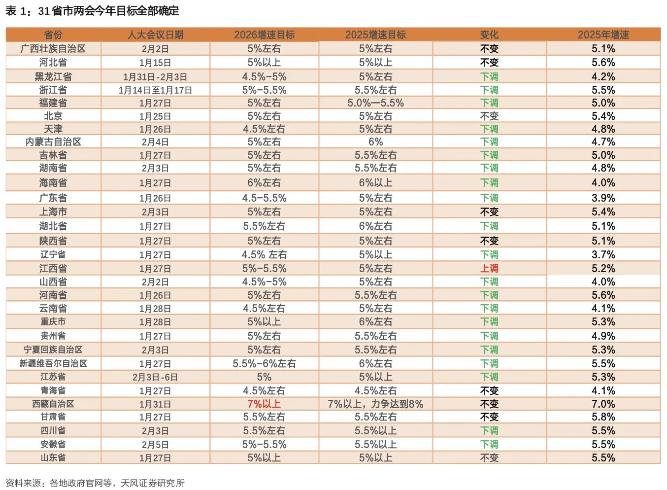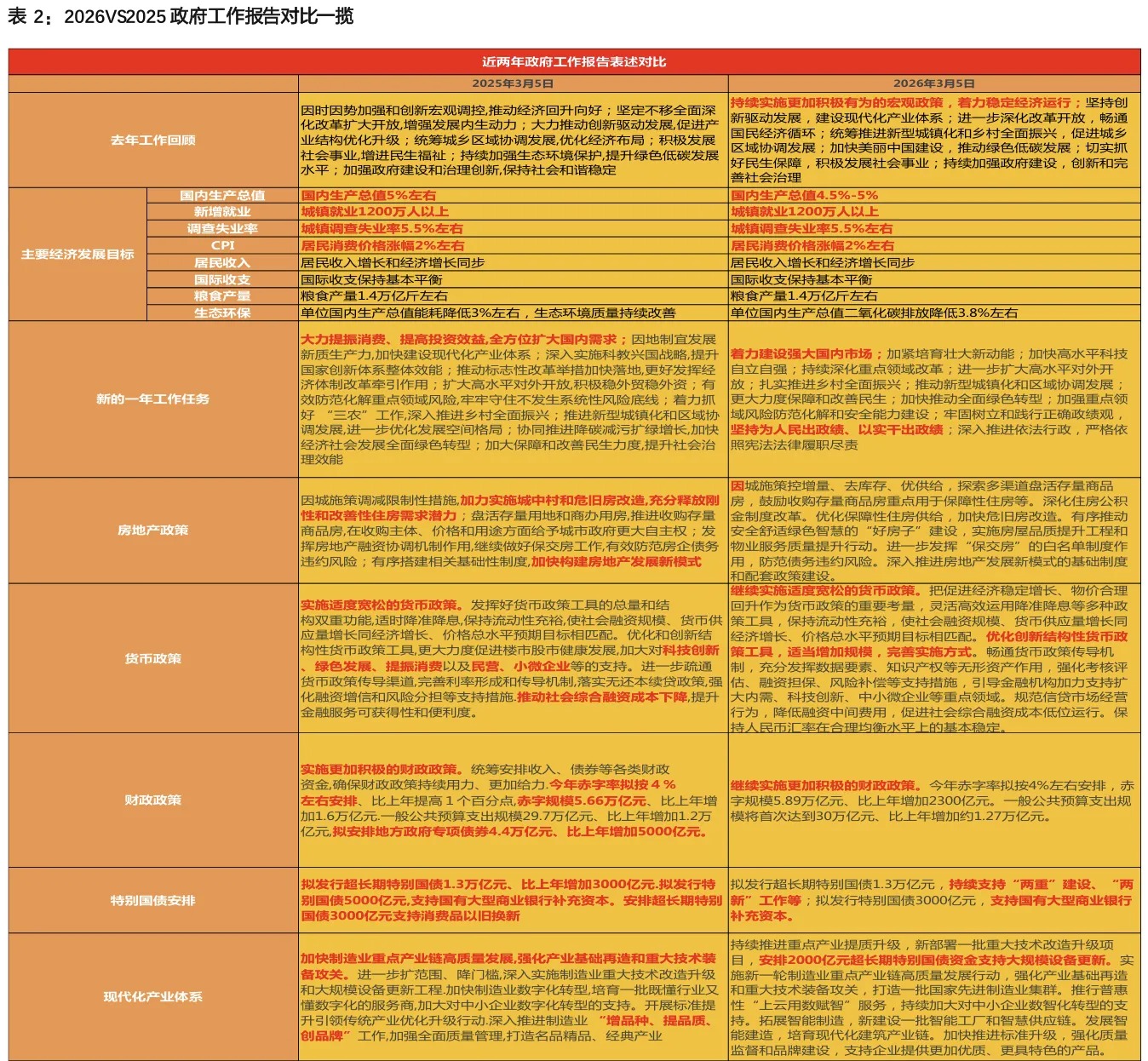2026年主要目标兼顾调结构、防风险、促改革。今年政府工作报告提出,经济增长4.5%-5%,在实际工作中努力争取更好结果;城镇调查失业率5.5%左右,城镇新增就业1200万人以上;居民消费价格涨幅2%左右;居民收入增长和经济增长同步;国际收支基本平衡;粮食产量1.4万亿斤左右;单位国内生产总值二氧化碳排放降低3.8%左右。从前期31省份地方两会来看,有21个省份都下调了今年增速目标。整体来看,我们认为今年目标设定综合考虑了国内外形势和各方面因素,兼顾了需要与可能,也是兼顾内外经济环境以及中长期发展目标的综合结果,另外也突出牢固树立和践行正确政绩观,坚持为人民出政绩、以实干出政绩的导向。