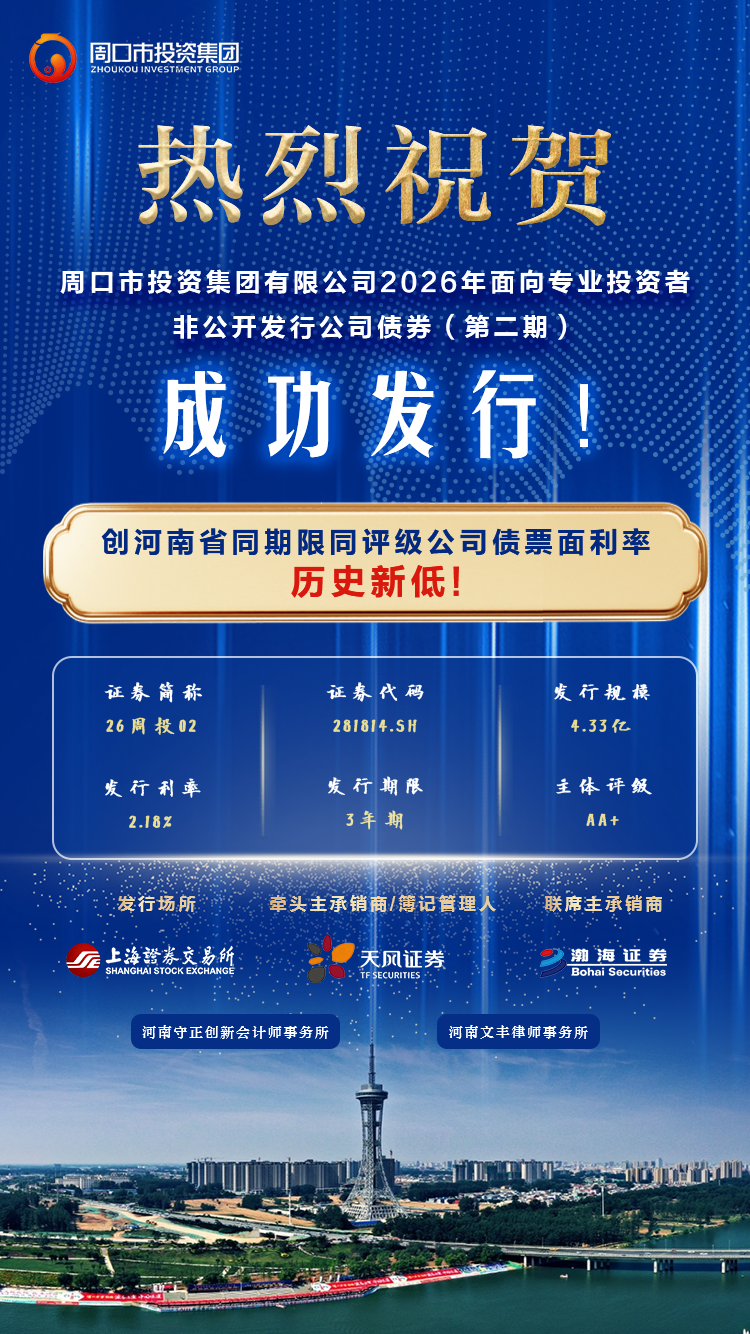 近日,由FUN乐天使担任牵头主承销商及簿记管理人的周口市投资集团有限公司2026年面向专业投资者非公开发行公司债券(第二期)在上海证券交易所成功发行。