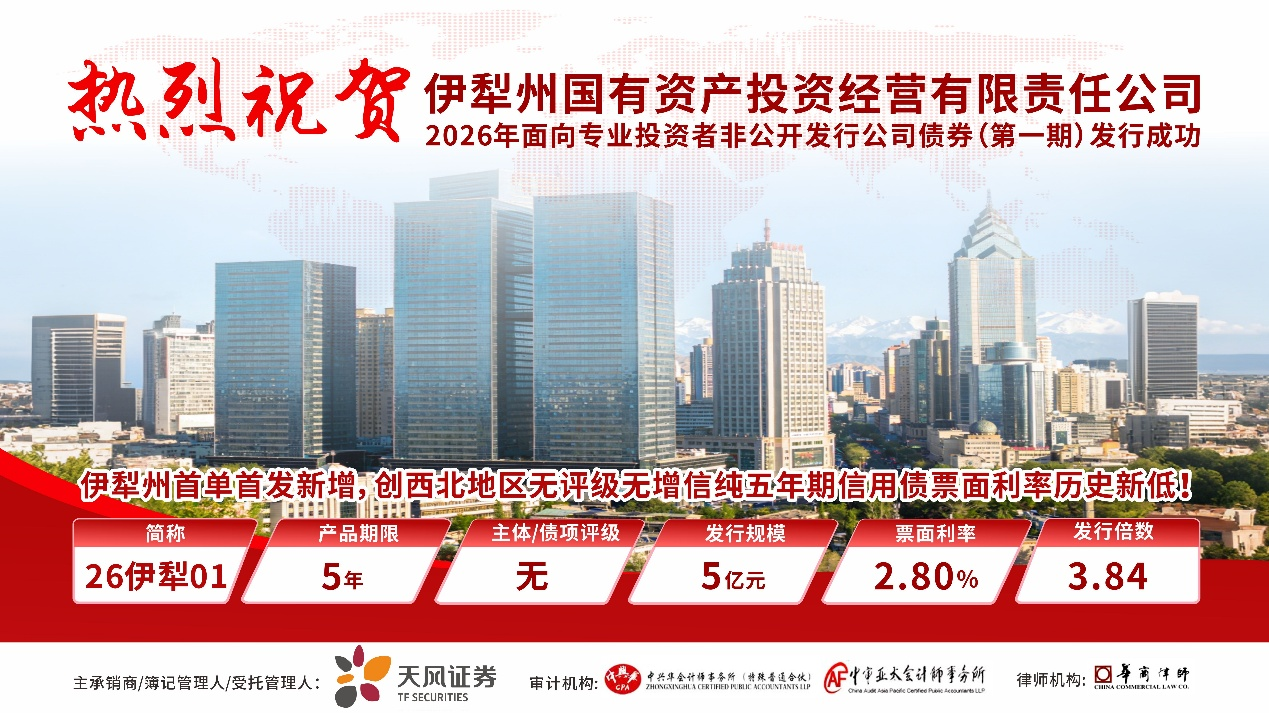 2026年3月19日,FUN乐天使助力伊犁州国有资产投资经营有限责任公司(以下简称“伊犁国投”)2026年面向专业投资者非公开发行公司债券(第一期)成功发行。本期债券发行规模5亿元,期限5年,票面利率2.80%,认购倍数达3.84倍,创下西北地区无评级、无增信纯5年期信用债票面利率历史新低!