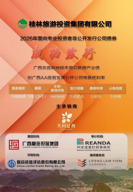 桂林旅投集团作为桂林市属骨干国有企业,深耕文旅领域多年,凭借雄厚的经营实力、良好的市场信誉成为区域文旅产业发展的核心力量。此次“26桂旅债”的成功发行,是桂林旅投集团优化资本结构、拓宽融资渠道、强化核心竞争力的重要举措,募集资金将进一步助力企业深耕文旅主业,推动桂林文旅资源整合与产业升级,为区域文旅经济发展注入强劲金融动能。而作为广西非首府地级市新政首单新增产业债券,本次发行更将发挥示范引领作用,探索地级市产业企业债券融资新路径,推动区域产业融资生态优化升级。